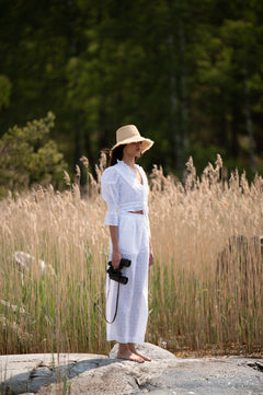 The Noemi blouse is a beautifully detailed piece crafted from 100% organic cotton with delicate white embroidery. Featuring a tie-front and hook & eye closure, it offers a feminine and sophisticated silhouette. Style it effortlessly with the matching Noemi skirt or Noemi trousers for a coordinated and elegant look, perfect for both casual and elevated occasions.